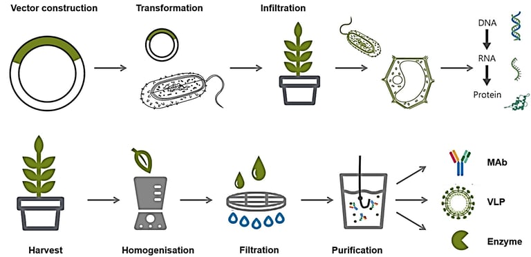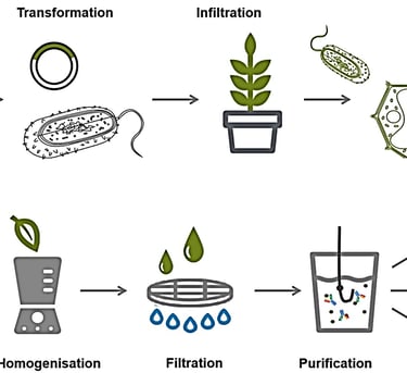 We first start with the vector containing the DNA sequence of the target protein, and then simply put it into a bacterium called Agrobacterium tumefaciens. We use electricity to help push the vector into the bacteria through a process called transformation, and once inside, we use a technology called osmosis to put the bacteria containing the DNA vector in the leaves of plants. We are using a class of carefully studied plants that grow rapidly and are easy to penetrate. Once in the plant, bacteria can transfer the DNA encoding protein to the plant cells, then "transcribe" it into RNA and "translate" it into protein. The process lasts for a few days, and leaves are harvested and proteins are extracted after three to six days.
