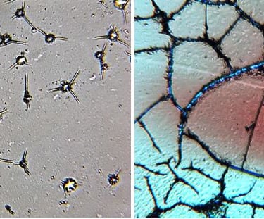 The CEHMDF has funded a number of research studies illuminating the origin of the colorful skin filaments and showing that Morgellons pathology is the result of an infection. Some mainstream medical practitioners claim that the microscopic colorful fibers are self-implanted textile fibers, or that patients think they are infested by bugs or worms. [No one would ever stuck textile fibers in themselves, that is almost impossible to do (one artist put stitches in her hand with great difficulty and pain) AND there are real arthropods and worms, as many microscropist TI's have taken their own photos.]
