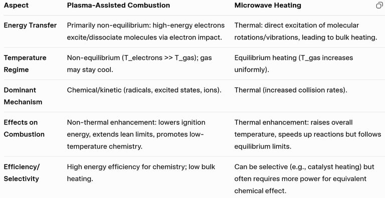 Note that microwave plasma (generated by microwaves at low pressure or in specific setups) is a form of non-equilibrium plasma (similar to PAC), not pure heating. It produces energetic electrons, radicals, and non-thermal effects, often used for ignition or flame enhancement. This differs from standard microwave heating, which avoids plasma formation to focus on thermal effects. In combustion literature, "microwave-assisted" often implies plasma when it involves discharges, but pure microwave heating is thermal.