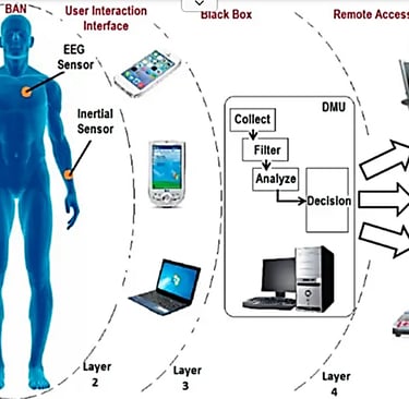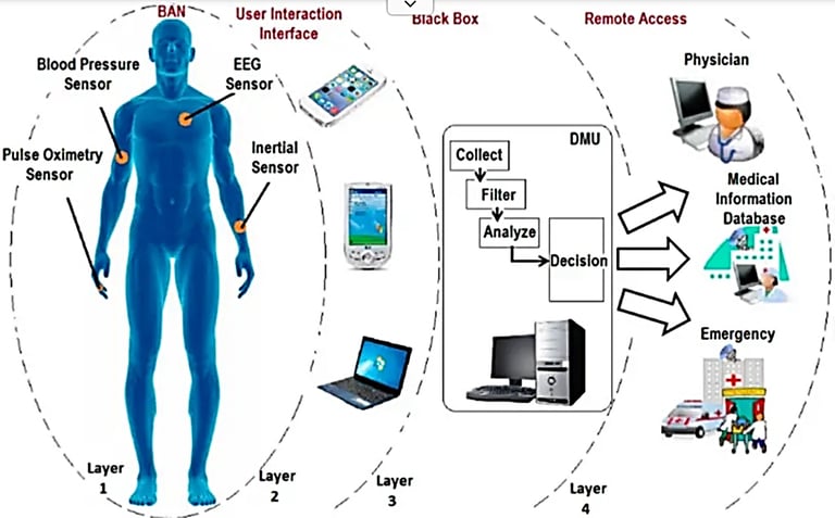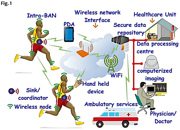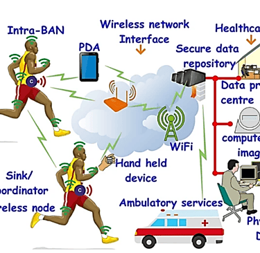 Global Positioning System (GPS): Integrated into WBAN hub/coordinator nodes for outdoor tracking. In pandemic surveillance models, GPS data allows for monitoring social distancing and movement patterns.
