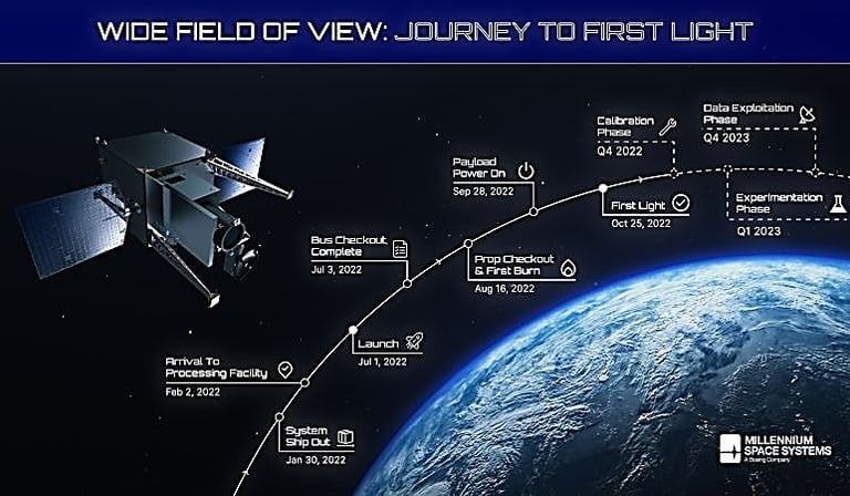 Space Systems Command's (SSC) Wide Field of View (WFOV) Testbed is a mid-sized geosynchronous satellite launched by the U.S. Space Force in 2022, designed to scout for future missile warning systems by continuously monitoring large areas of Earth with advanced infrared sensors to detect missile launches, providing crucial data for next-generation Overhead Persistent Infrared (OPIR) missions. Manufactured by Millennium Space Systems (a Boeing company) with an L3Harris sensor, it uses a large 4Kx4K focal plane to see over 3,000 km at once, bridging current capabilities with future missile tracking and defense needs. 3,000 miles is a substantial distance, essentially the entire width of the country plus a little extra!.