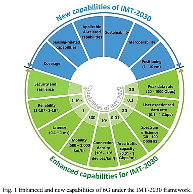 Technological evolution from 5G to 6G systems is poised to deliver several key capabilities and features, which is illustrated in Fig. 1, where the key performance indicators of IMT-2030 (6G) and IMT-2020 (5G) are compared, and several of them have significant implications for antenna technologies [4], [5].